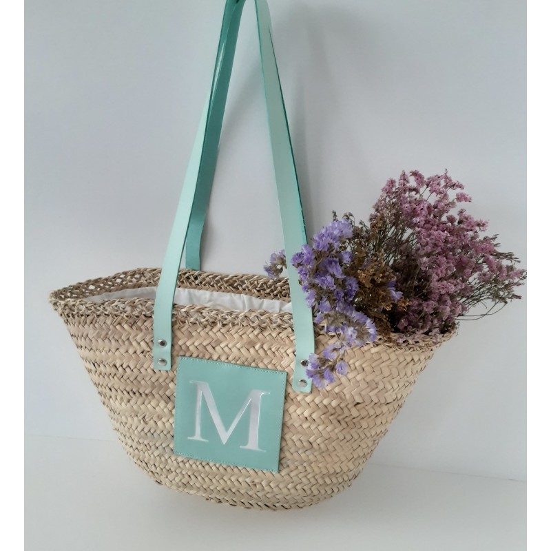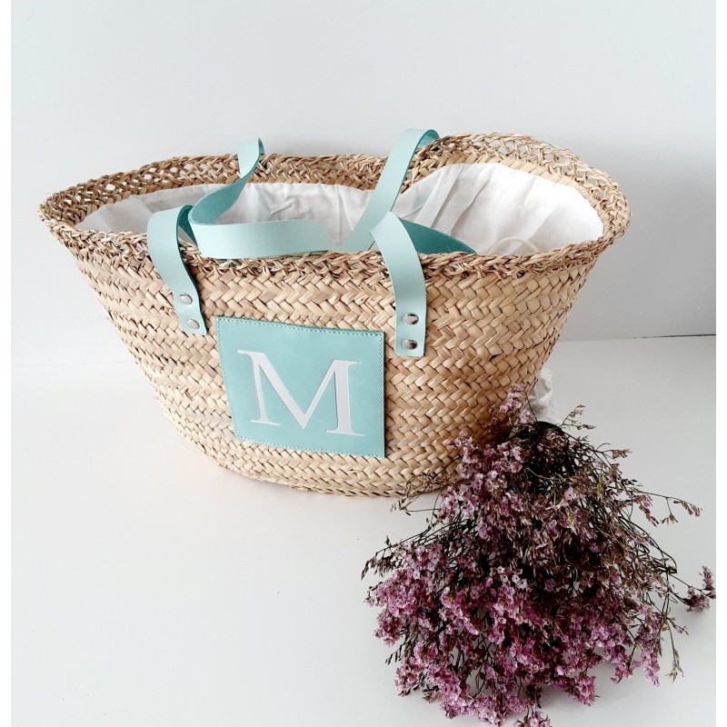 Cesta mediana de palma con letra personalizada y remate de rejilla, cierre de tela interior con frunce, adorno y asa larga de piel.
